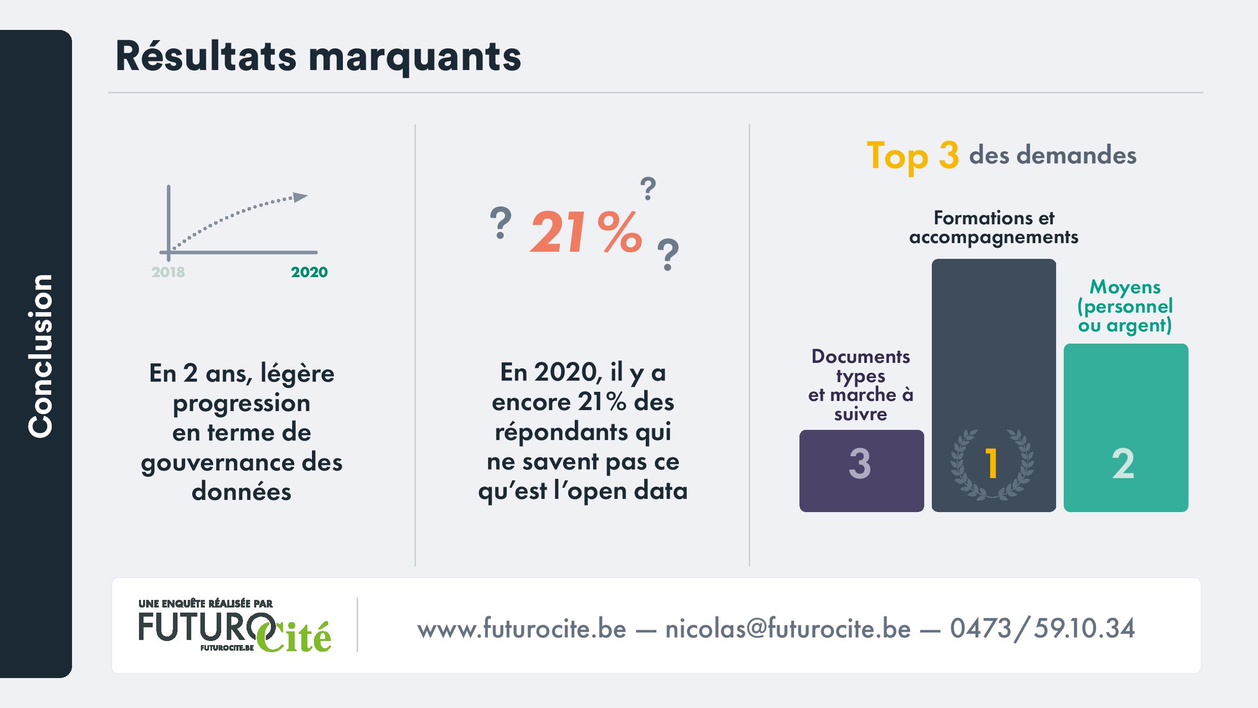 Pour conclure, même si on note une légère progression en terme de gouvernance des données depuis 2018, nous ne pouvons toujours pas affirmer qu’il existe une culture forte de la donnée dans nos villes et communes.